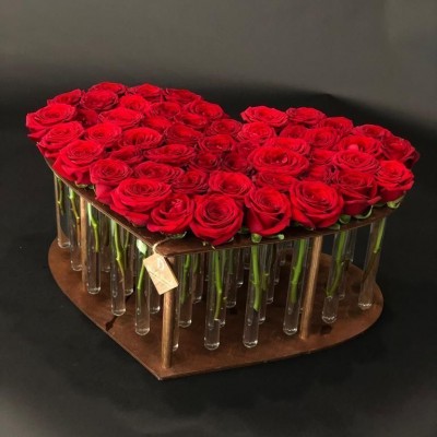 Сердце из 51 розы на каркасе с колбами
