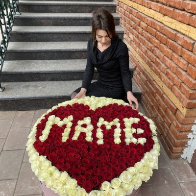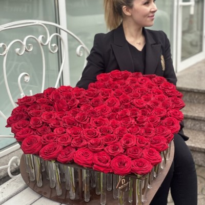 Сердце 101 роза на каркасе с колбами