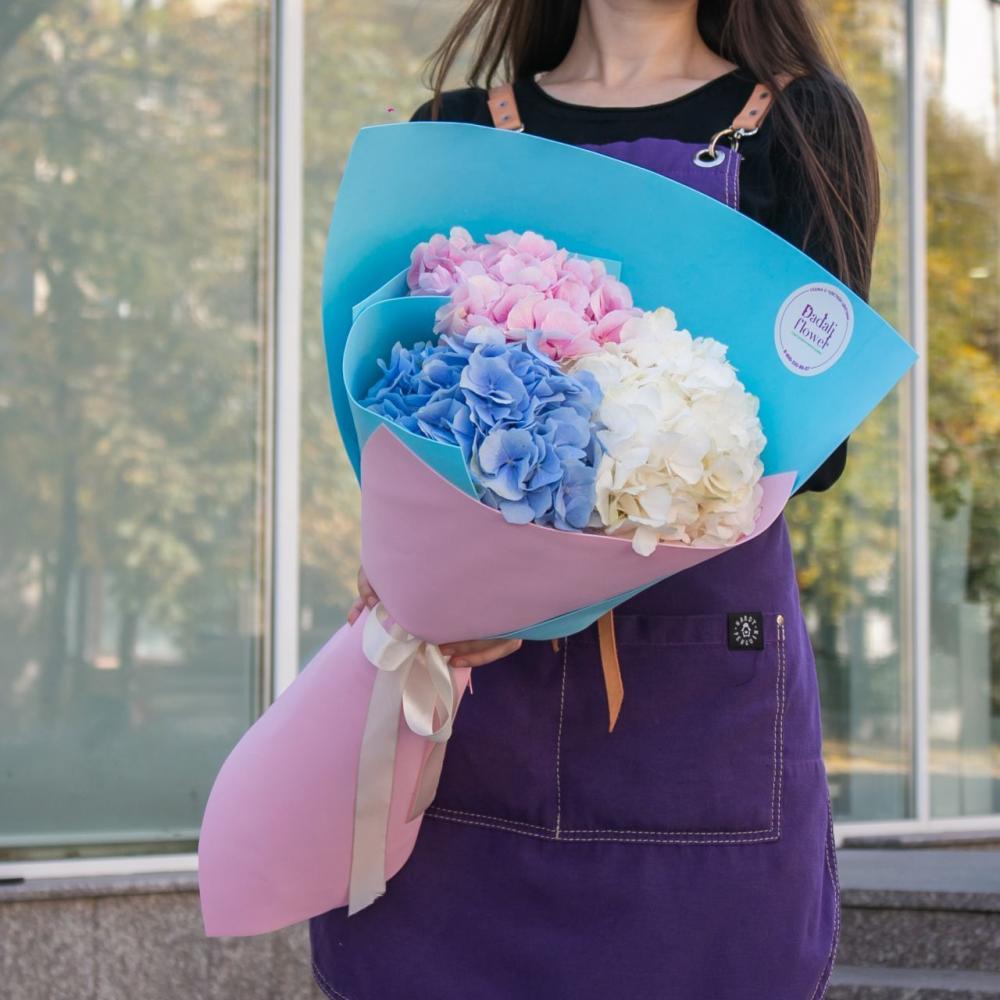 Букет собран из гортензий с любовью от нашего флориста . Вы всегда можете купить такой букет с доставкой в нашем онлайн магазине цветов и подарков находящийся в г.Нальчике. Опытные флористы сформируют ваш букет из свежих цветов, и курьер в течении часа доставит Ваш букет по адресу лично в руки получателю, получив в ответ благодарную улыбку.высота 60см, диаметр 40см