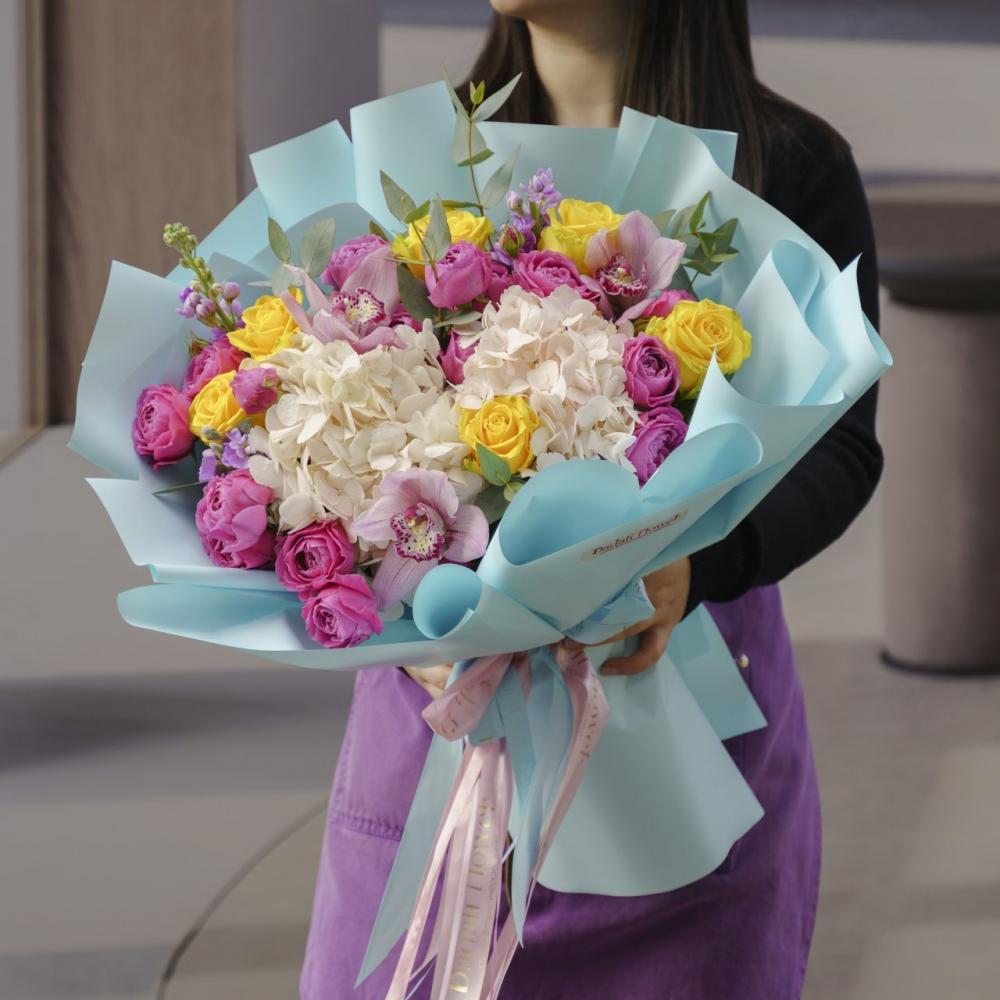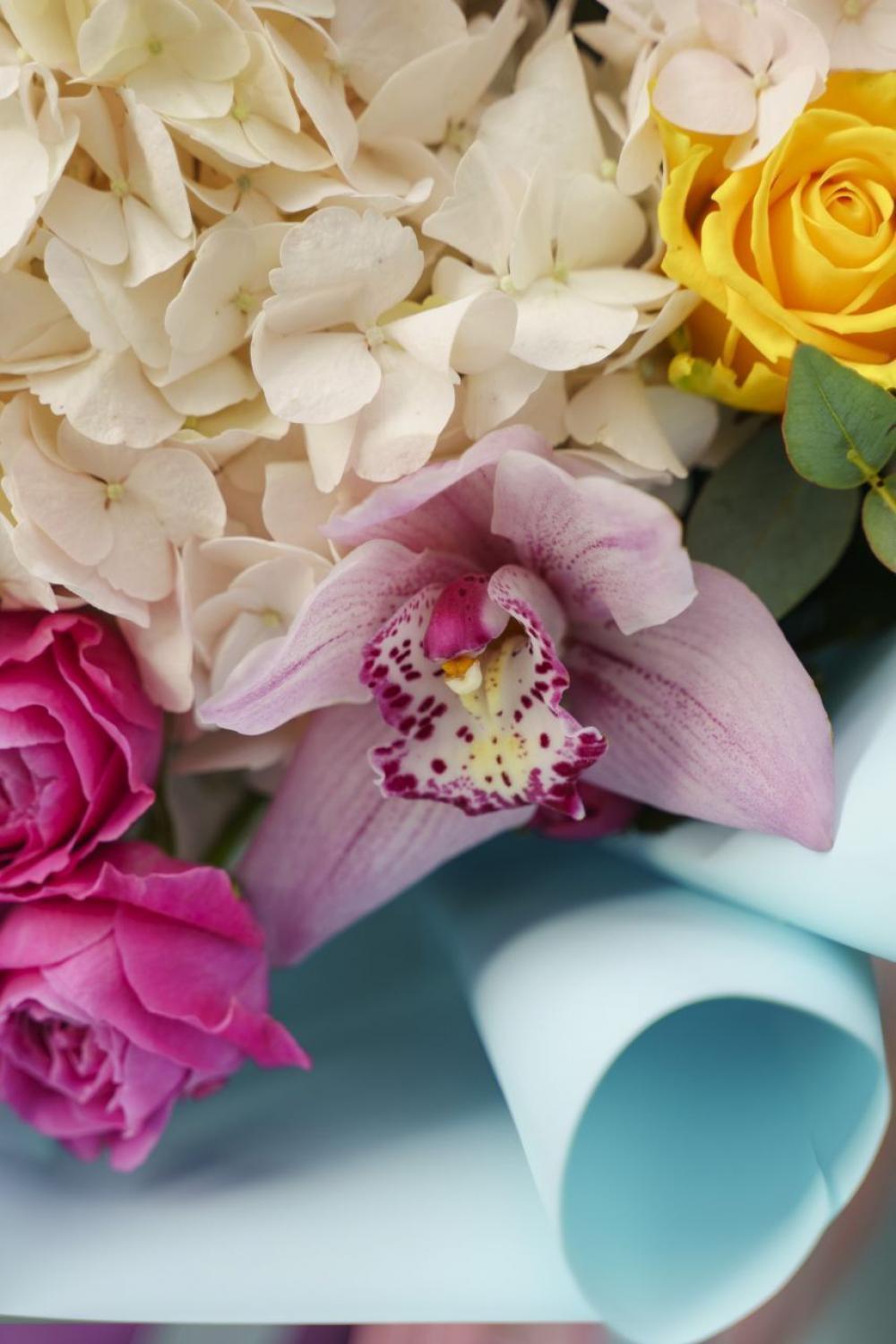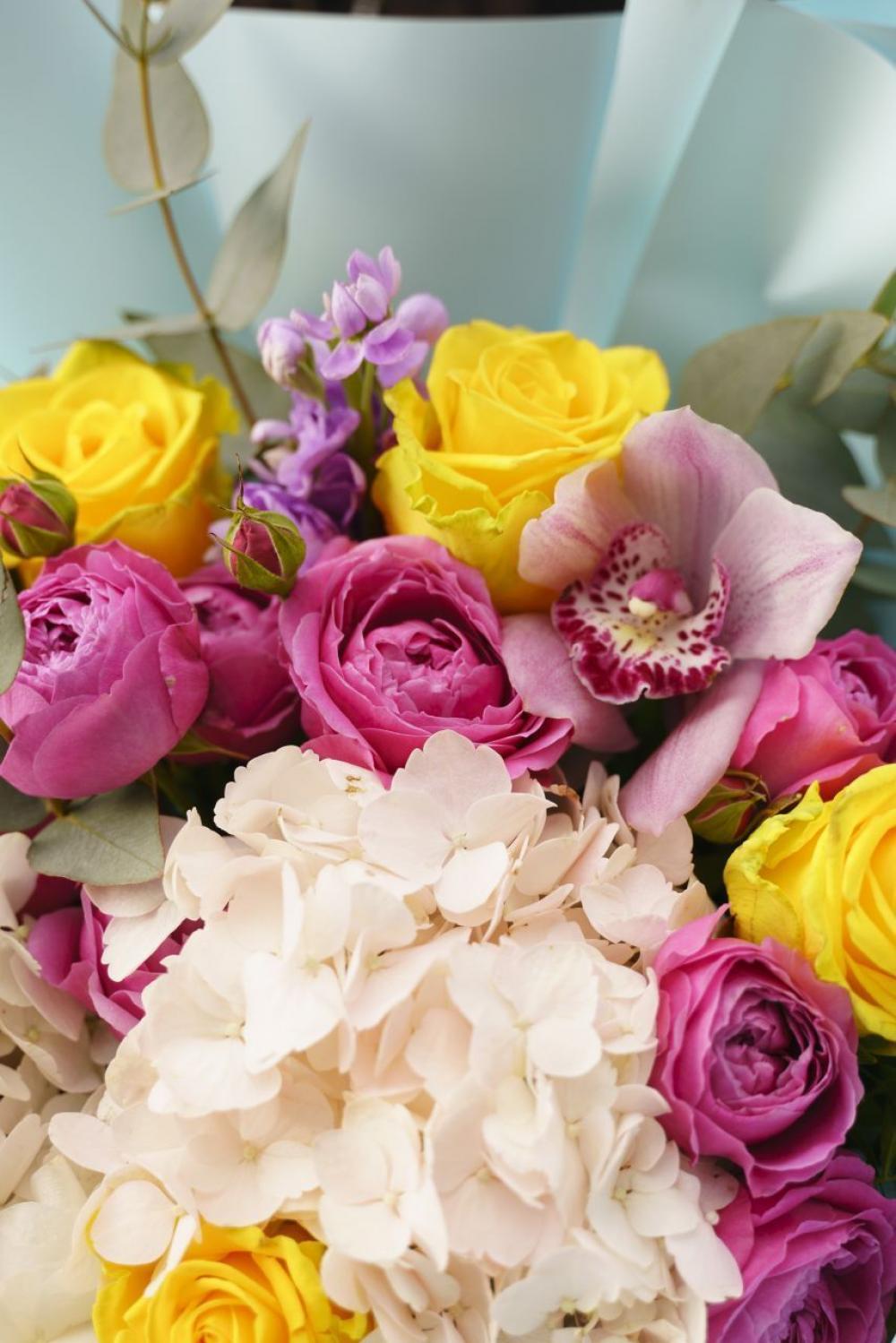 Весенний, яркий, свежий букет из экзотических цветов: орхидеи, гортензии, эвкалипта, дельфиниум и кустовых пионовидных роз. Вы всегда можете купить такой букет с доставкой в нашем онлайн магазине цветов и подарков, находящийся в г.Нальчике. Опытные флористы сформируют ваш букет из свежих цветов, и курьер в течении часа доставит Ваш букет по адресу лично в руки получателю, получив в ответ благодарную улыбку.