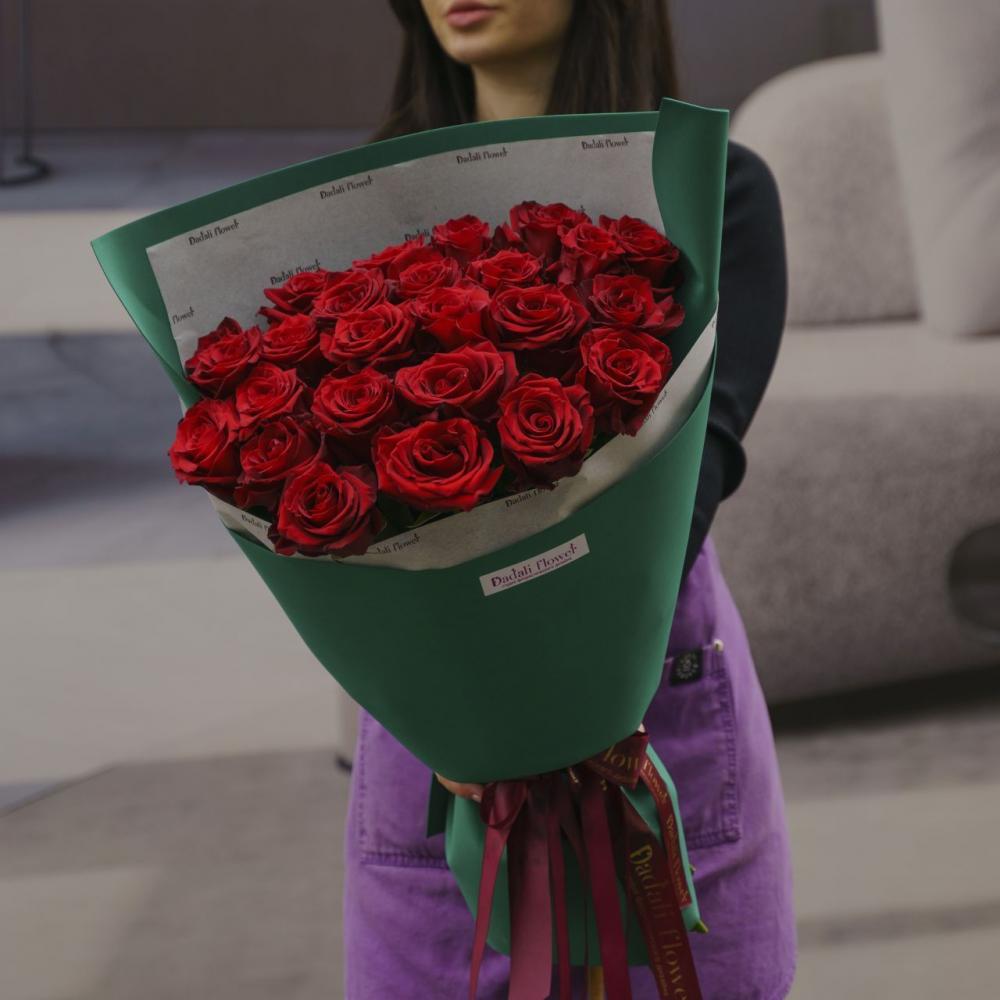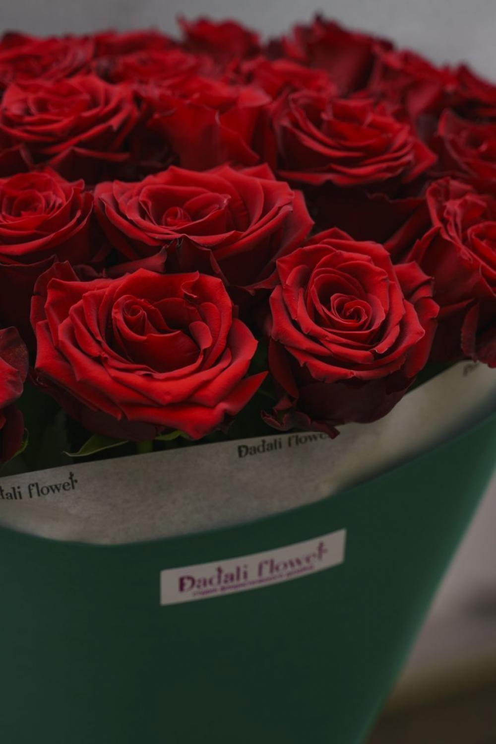 Букет из 35 красных роз в зеленом фоамиране. Вы всегда можете купить такой букет с доставкой в нашем онлайн магазине цветов и подарков, находящийся в г.Нальчике. Опытные флористы сформируют ваш букет из свежих цветов, и курьер в течении часа доставит Ваш букет по адресу лично в руки получателю, получив в ответ благодарную улыбку.