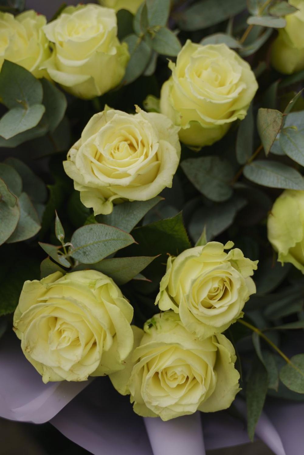 Букет из белых роз с эвкалиптом. Вы всегда можете купить такой букет с доставкой в нашем онлайн магазине цветов и подарков, находящийся в г.Нальчике. Опытные флористы сформируют ваш букет из свежих цветов, и курьер в течении часа доставит Ваш букет по адресу лично в руки получателю, получив в ответ благодарную улыбку.