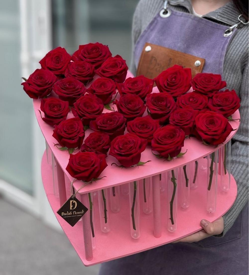 Розовый бокс из сердца с колбами, в каждой из которой стоят свежие розы