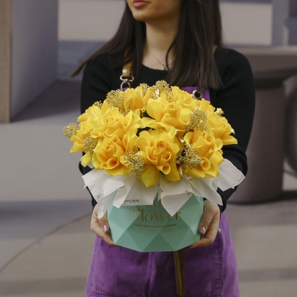 Яркая шляпная коробка с желтыми розами. Вы всегда можете купить такой букет с доставкой в нашем онлайн магазине цветов и подарков, находящийся в г.Нальчике. Опытные флористы сформируют ваш букет из свежих цветов, и курьер в течении часа доставит Ваш букет по адресу лично в руки получателю, получив в ответ благодарную улыбку.