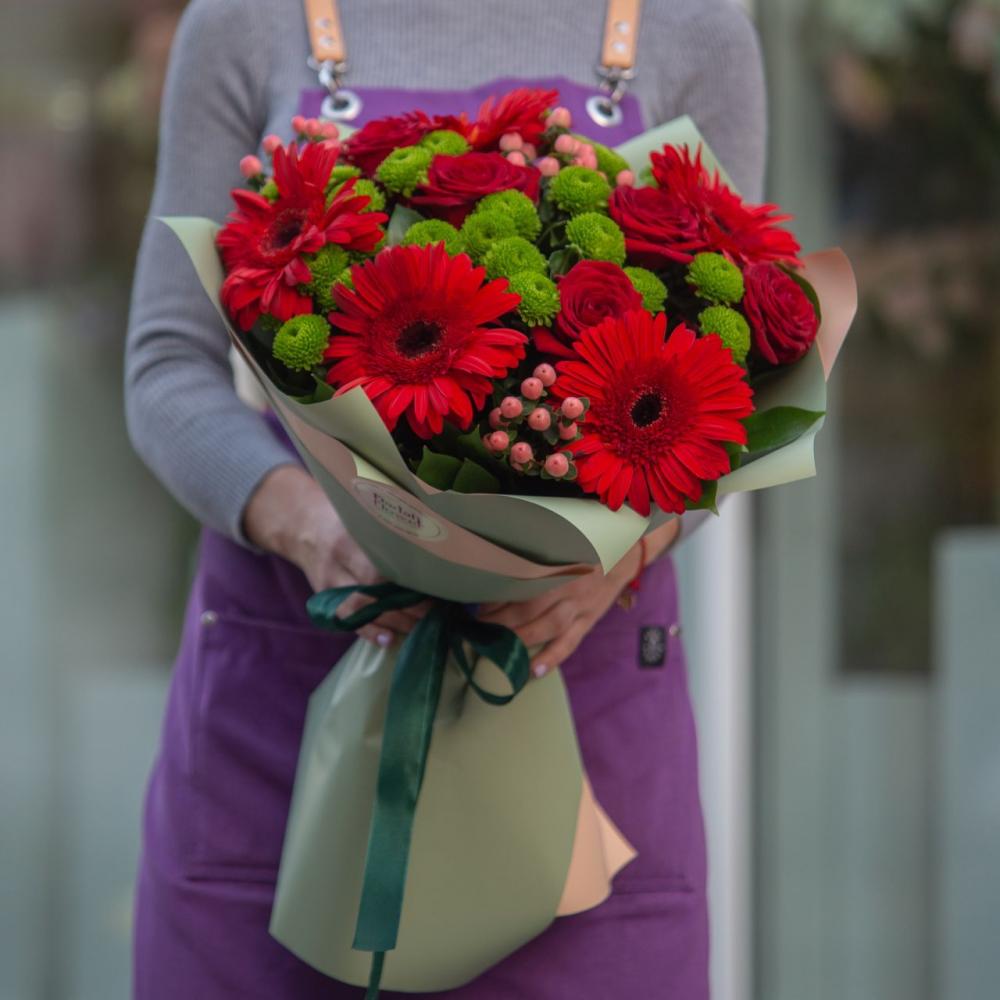 Букет составлен из Гербер и кустовой хризантемы . Вы всегда можете купить такой букет с доставкой в нашем онлайн магазине цветов и подарков находящийся в г.Нальчике. Опытные флористы сформируют ваш букет из свежих цветов, и курьер в течении часа доставит Ваш букет по адресу лично в руки получателю, получив в ответ благодарную улыбку.